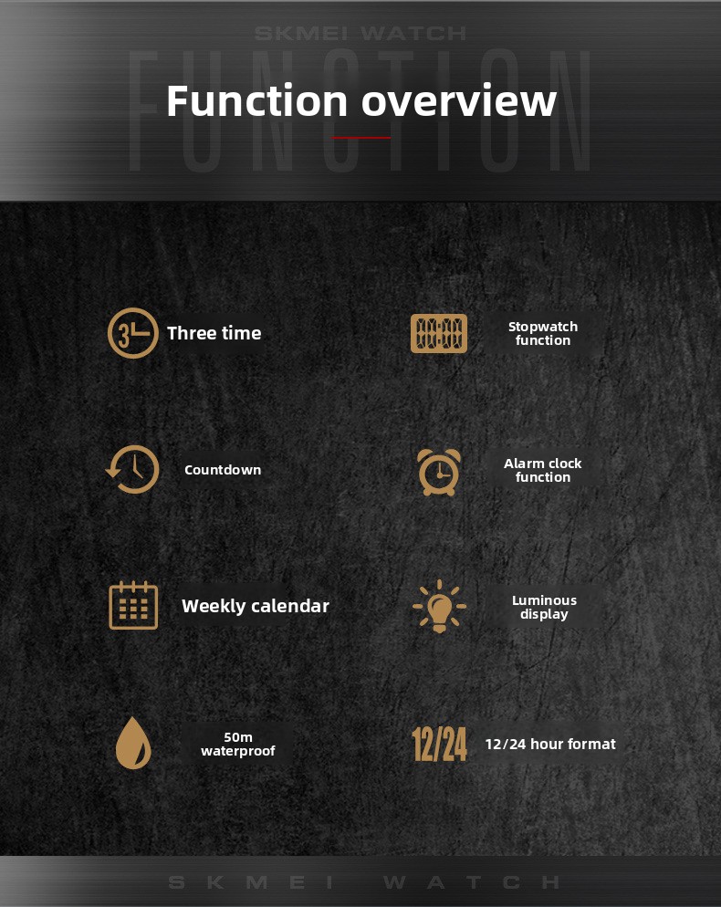 Multifunctional: Features time, stopwatch, date alarm, weekday display, LED backlight, hourly chime, 12/24-hour format, and countdown.